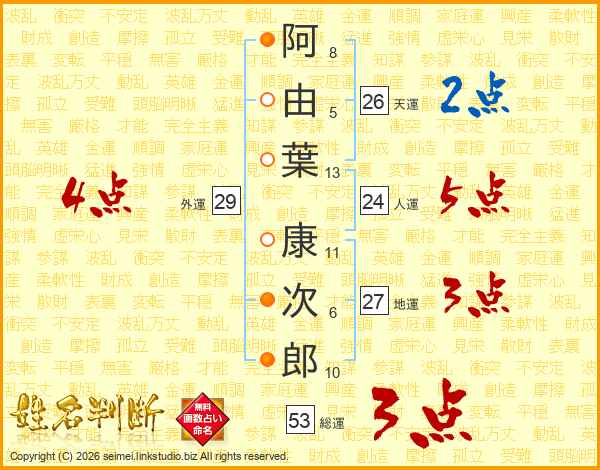 阿由葉康次郎さんの天運は26画の2点!