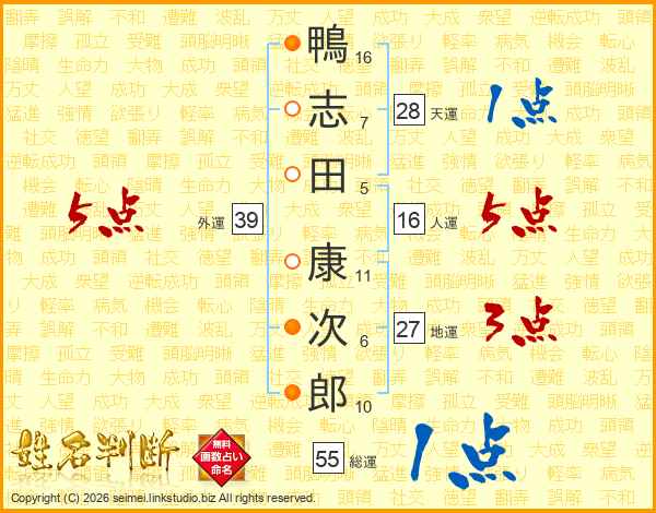 鴨(16画)志(7画)田(5画) 康(11画)次(6画)郎(10画)