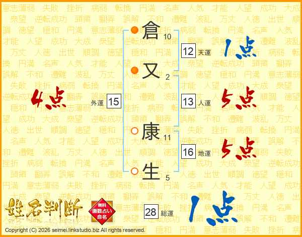 倉(10画)又(2画) 康(11画)生(5画)