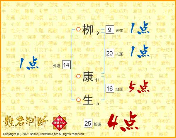 生活面を象徴する運勢です。外部から受ける影響力を表し、結婚運、家庭運や職場、環境への順応性を表します。総運から人運を引いた画数。姓や名が1文字の場合を除く。