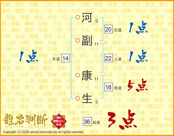 生活面を象徴する運勢です。外部から受ける影響力を表し、結婚運、家庭運や職場、環境への順応性を表します。総運から人運を引いた画数。姓や名が1文字の場合を除く。