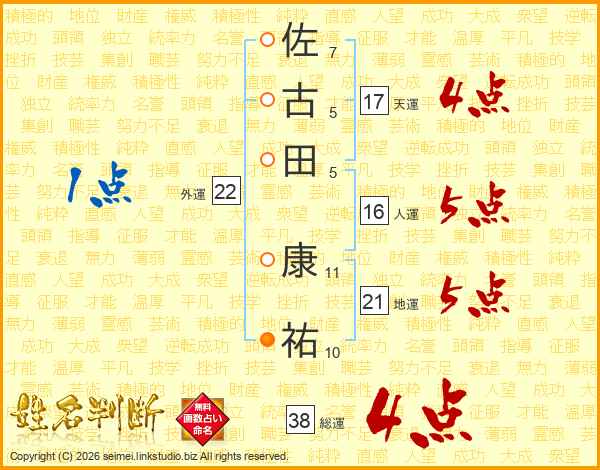 佐(7画)古(5画)田(5画) 康(11画)祐(10画)