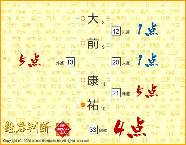 生活面を象徴する運勢です。外部から受ける影響力を表し、結婚運、家庭運や職場、環境への順応性を表します。総運から人運を引いた画数。姓や名が1文字の場合を除く。