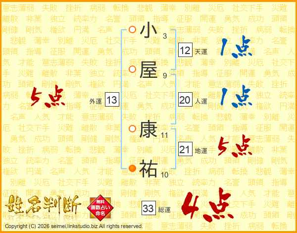 小屋康祐さんの総運は33画の4点!