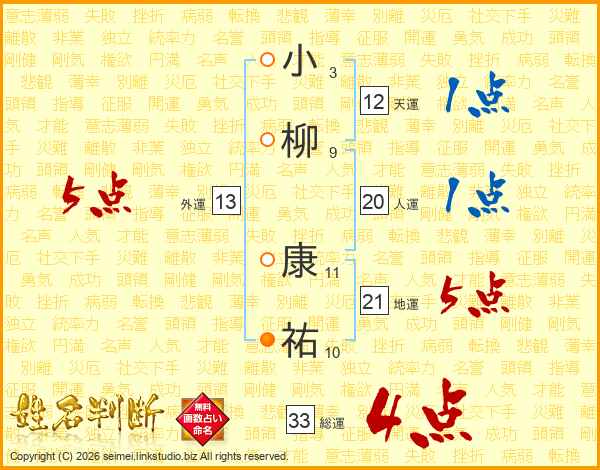 小柳康祐さんの総運は33画の4点!