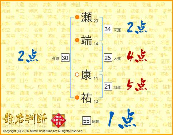 瀬(20画)端(14画) 康(11画)祐(10画)