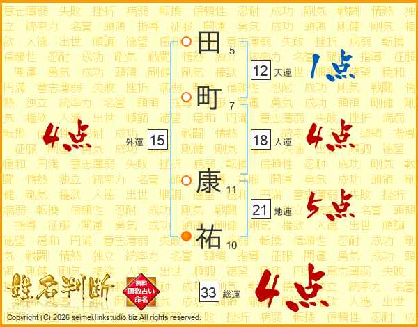 生活面を象徴する運勢です。外部から受ける影響力を表し、結婚運、家庭運や職場、環境への順応性を表します。総運から人運を引いた画数。姓や名が1文字の場合を除く。