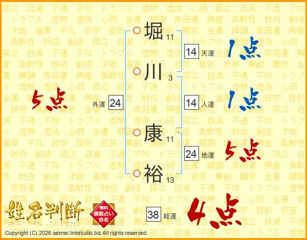 堀川康裕さんの総運は38画の4点!