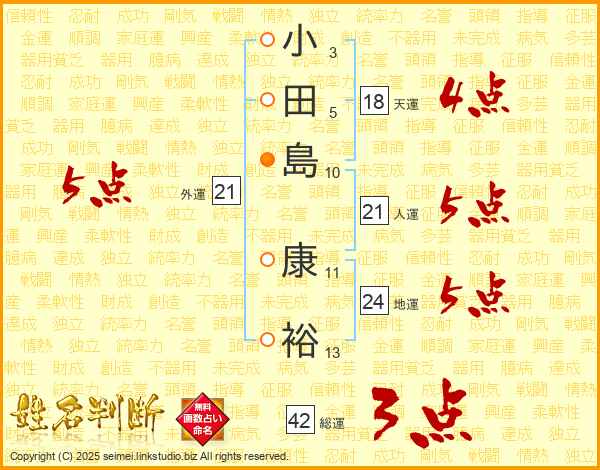 小(3画)田(5画)島(10画) 康(11画)裕(13画)
