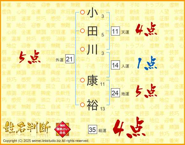 小田川康裕さんの総運は35画の4点!