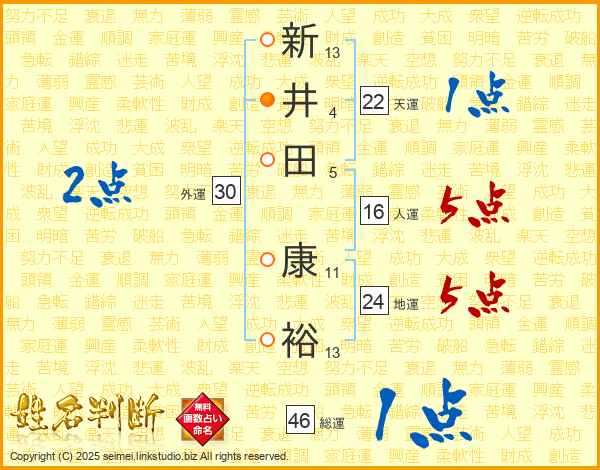 新(13画)井(4画)田(5画) 康(11画)裕(13画)