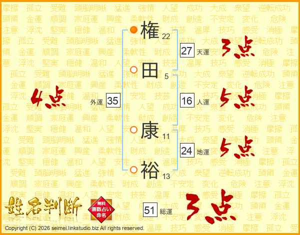 権(22画)田(5画) 康(11画)裕(13画)