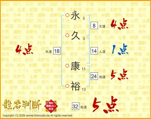 生活面を象徴する運勢です。外部から受ける影響力を表し、結婚運、家庭運や職場、環境への順応性を表します。総運から人運を引いた画数。姓や名が1文字の場合を除く。