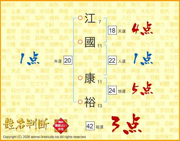 生活面を象徴する運勢です。外部から受ける影響力を表し、結婚運、家庭運や職場、環境への順応性を表します。総運から人運を引いた画数。姓や名が1文字の場合を除く。
