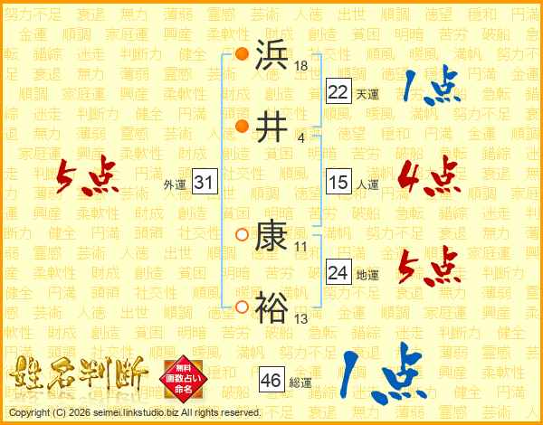 生活面を象徴する運勢です。外部から受ける影響力を表し、結婚運、家庭運や職場、環境への順応性を表します。総運から人運を引いた画数。姓や名が1文字の場合を除く。