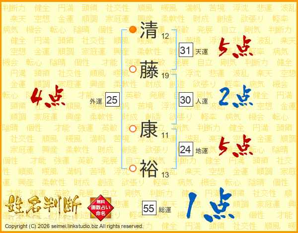 あなたの人生を表す1番重要な運勢です。生涯を通じて影響する総合運となり、主に50歳以降の晩年期に影響を及ぼします。苗字と名前の合計画数。