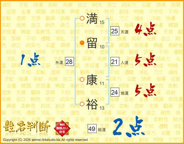 満(15画)留(10画) 康(11画)裕(13画)