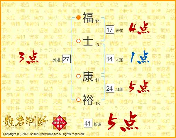 福(14画)士(3画) 康(11画)裕(13画)