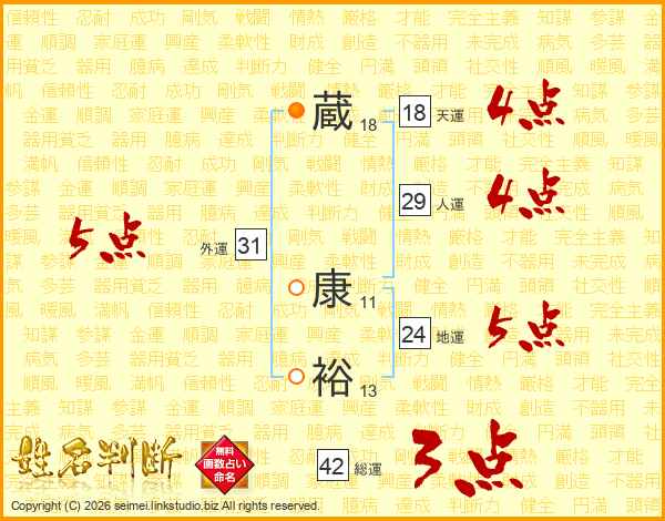 蔵(18画) 康(11画)裕(13画)