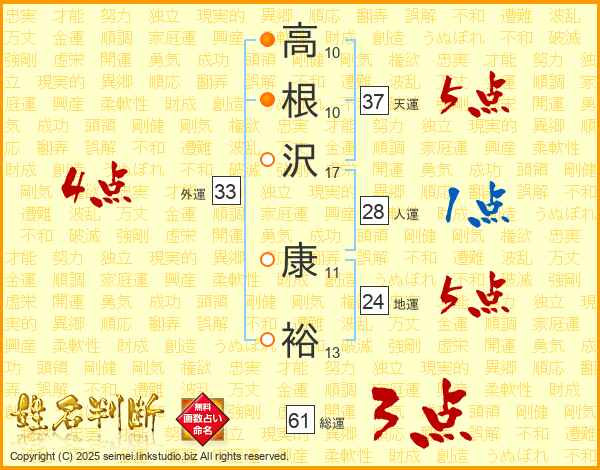 高(10画)根(10画)沢(17画) 康(11画)裕(13画)