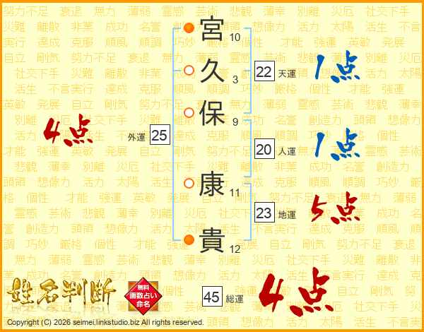 宮(10画)久(3画)保(9画) 康(11画)貴(12画)