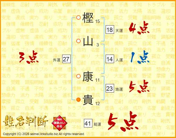 樫(15画)山(3画) 康(11画)貴(12画)