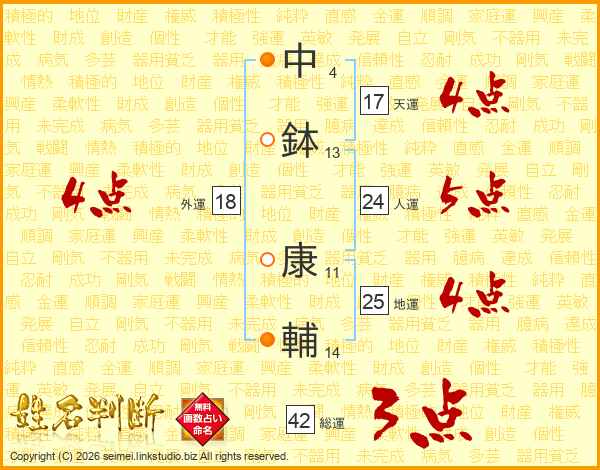 中(4画)鉢(13画) 康(11画)輔(14画)
