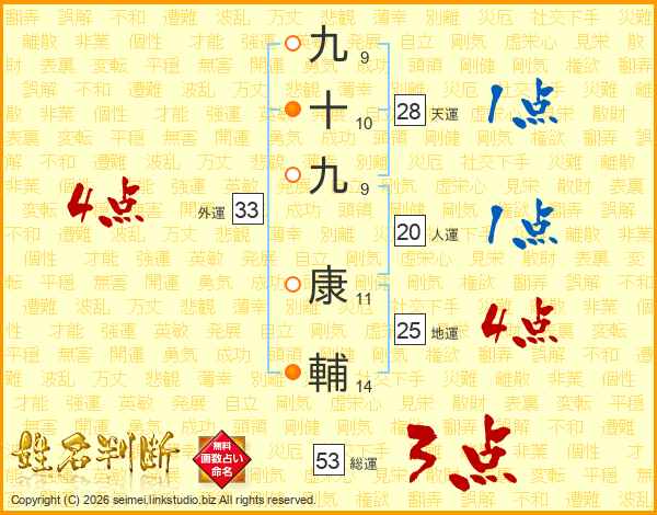 九(9画)十(10画)九(9画) 康(11画)輔(14画)