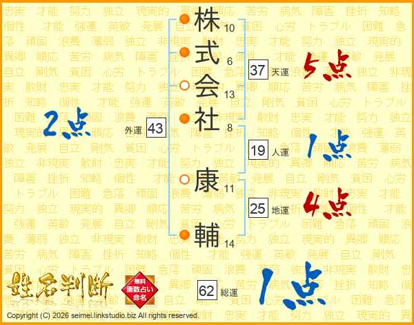 株(10画)式(6画)会(13画)社(8画) 康(11画)輔(14画)