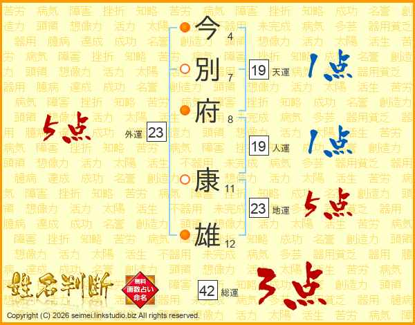 今(4画)別(7画)府(8画) 康(11画)雄(12画)