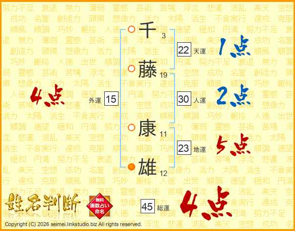 千藤康雄さんの総運は45画の4点!