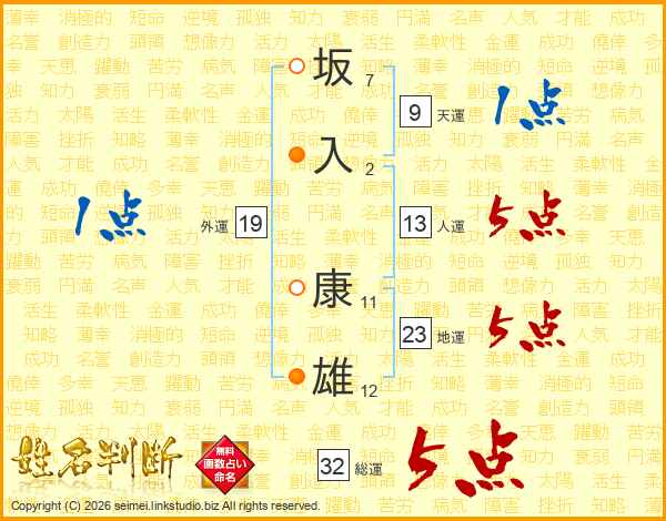 生活面を象徴する運勢です。外部から受ける影響力を表し、結婚運、家庭運や職場、環境への順応性を表します。総運から人運を引いた画数。姓や名が1文字の場合を除く。
