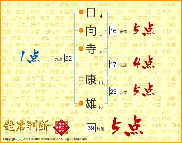 日(4画)向(6画)寺(6画) 康(11画)雄(12画)