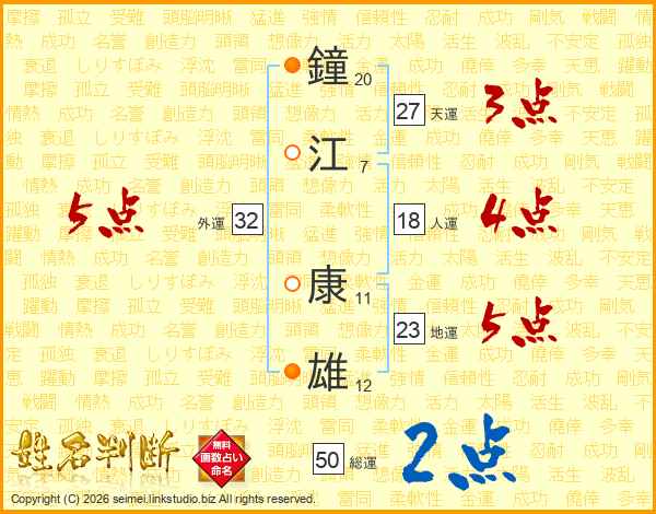 鐘(20画)江(7画) 康(11画)雄(12画)