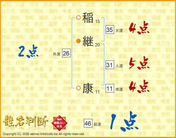 生活面を象徴する運勢です。外部から受ける影響力を表し、結婚運、家庭運や職場、環境への順応性を表します。総運から人運を引いた画数。姓や名が1文字の場合を除く。