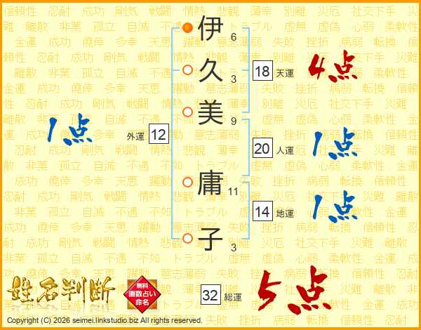 伊(6画)久(3画)美(9画) 庸(11画)子(3画)