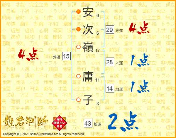 安(6画)次(6画)嶺(17画) 庸(11画)子(3画)