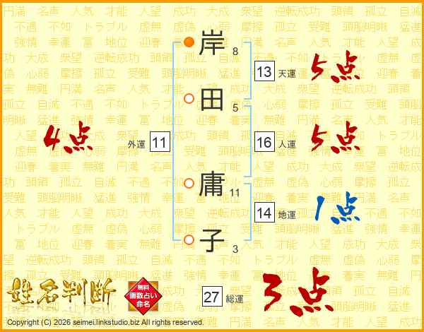 あなたの人生を表す1番重要な運勢です。生涯を通じて影響する総合運となり、主に50歳以降の晩年期に影響を及ぼします。苗字と名前の合計画数。