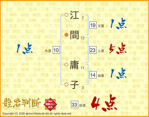 生活面を象徴する運勢です。外部から受ける影響力を表し、結婚運、家庭運や職場、環境への順応性を表します。総運から人運を引いた画数。姓や名が1文字の場合を除く。