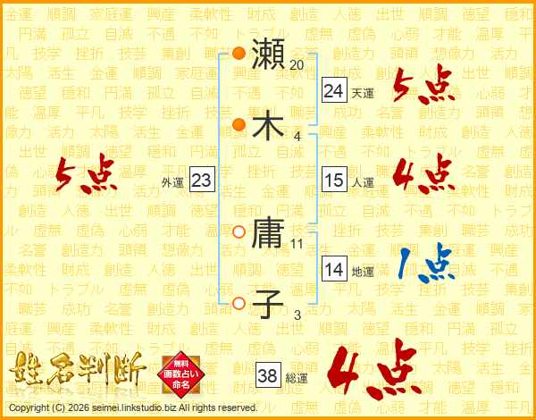 瀬(20画)木(4画) 庸(11画)子(3画)