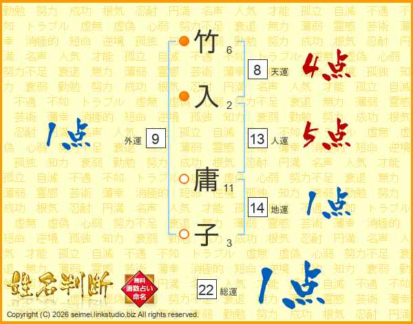 生活面を象徴する運勢です。外部から受ける影響力を表し、結婚運、家庭運や職場、環境への順応性を表します。総運から人運を引いた画数。姓や名が1文字の場合を除く。