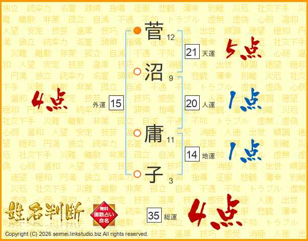菅(12画)沼(9画) 庸(11画)子(3画)