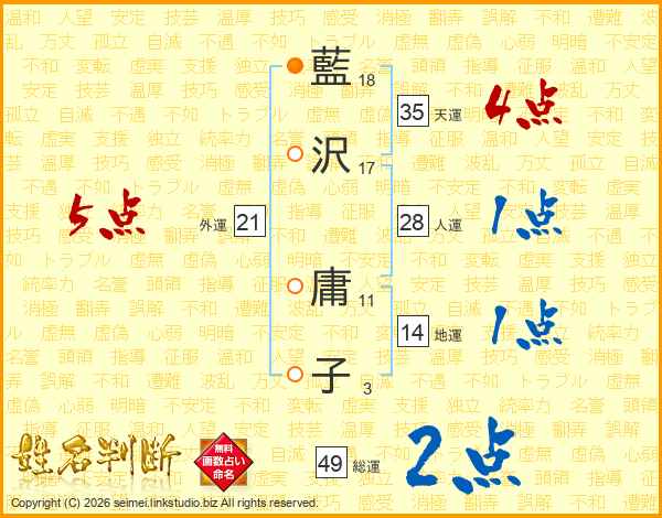 藍(18画)沢(17画) 庸(11画)子(3画)