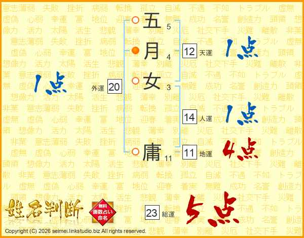 生活面を象徴する運勢です。外部から受ける影響力を表し、結婚運、家庭運や職場、環境への順応性を表します。総運から人運を引いた画数。姓や名が1文字の場合を除く。