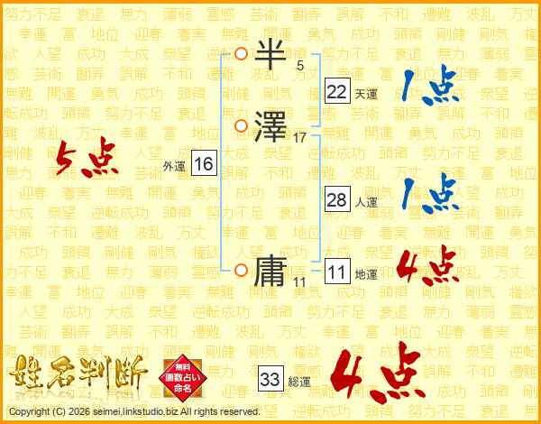生活面を象徴する運勢です。外部から受ける影響力を表し、結婚運、家庭運や職場、環境への順応性を表します。総運から人運を引いた画数。姓や名が1文字の場合を除く。
