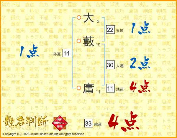 生活面を象徴する運勢です。外部から受ける影響力を表し、結婚運、家庭運や職場、環境への順応性を表します。総運から人運を引いた画数。姓や名が1文字の場合を除く。