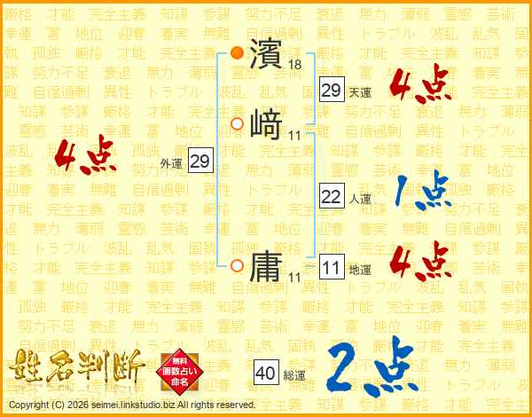 あなたの人生を表す1番重要な運勢です。生涯を通じて影響する総合運となり、主に50歳以降の晩年期に影響を及ぼします。苗字と名前の合計画数。