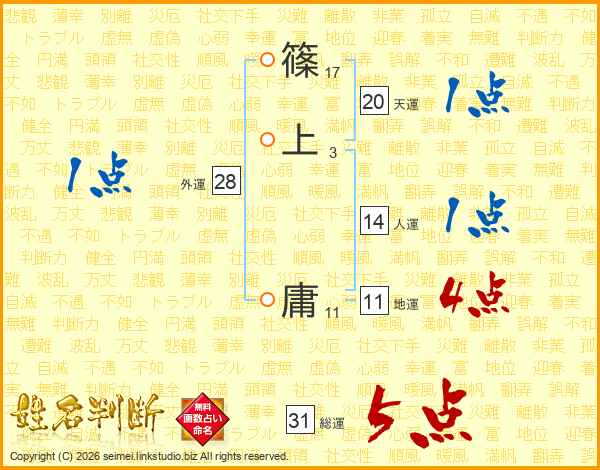生活面を象徴する運勢です。外部から受ける影響力を表し、結婚運、家庭運や職場、環境への順応性を表します。総運から人運を引いた画数。姓や名が1文字の場合を除く。