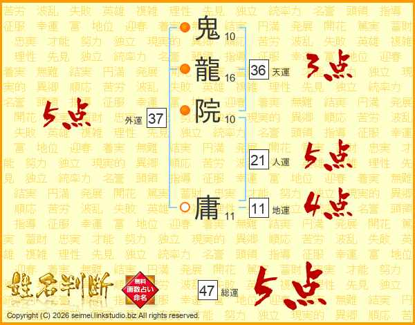 鬼(10画)龍(16画)院(10画) 庸(11画)