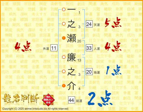 一之瀬廉之介さんの総運は44画の2点!